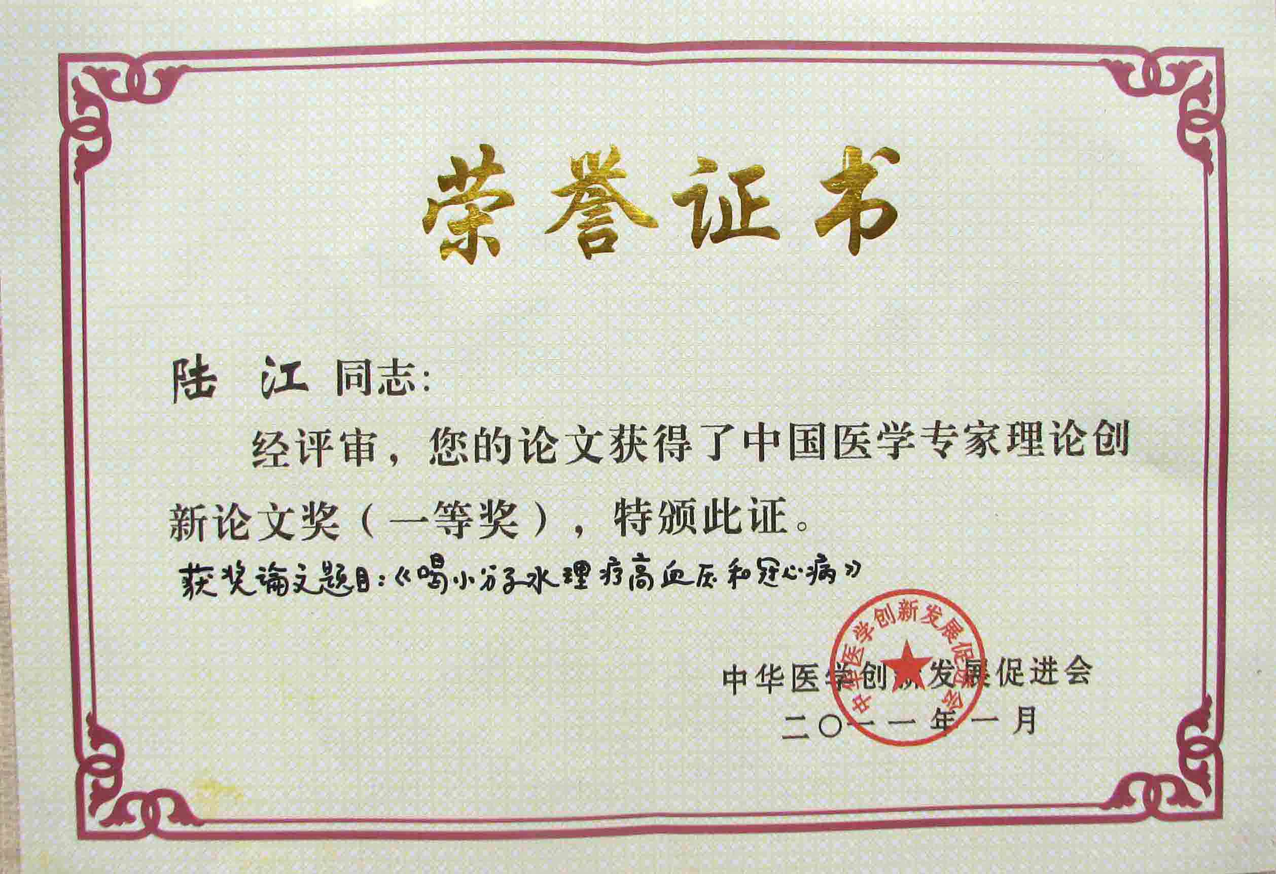新疆63歲的賀兆生飲用一年,冠心病未愈,他用電話介紹是食堂管理員,問他食量多少?說吃七八分飽,睡前還吃兩袋牛奶,陸 江說我在論文和書中多次批判“吃七八分飽”,關(guān)照患者務(wù)必用“己饑方食”控制主食肉食量,要他把牛奶改在早中餐吃,減少主食肉食量,建議不吃晩餐,晚上只吃一個(gè)蘋果,再經(jīng)幾個(gè)月補(bǔ)水節(jié)食,治愈了21年的冠心病和肥胖、失眠等病,信中由衷地感激陸 江為再生父母。[13]因?yàn)獒t(yī)生從未過問他的膳食習(xí)慣,只管開處方藥或手術(shù),父母也不會叫他不吃晩飯。
